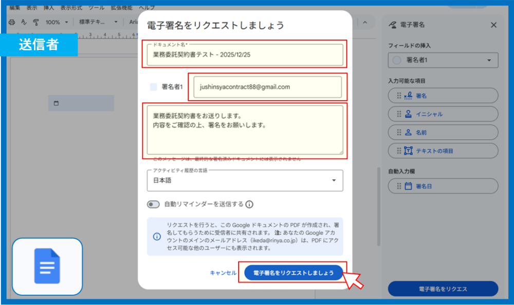 はい、可能です。電子署名のリクエストはメールで送信され、受け取った側はGoogleアカウントを持っていなくても、指示に従って署名することができます。
