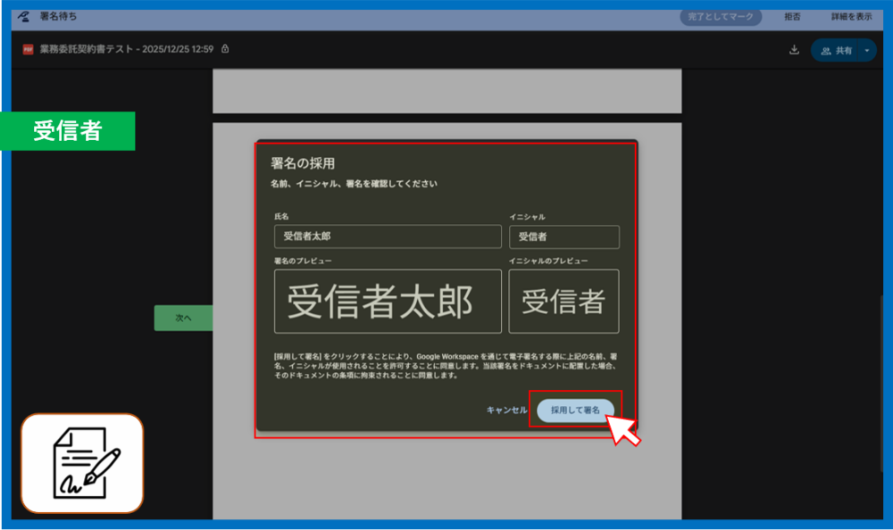 ▶画面の案内に沿って署名を入力し「採用して署名」をクリック